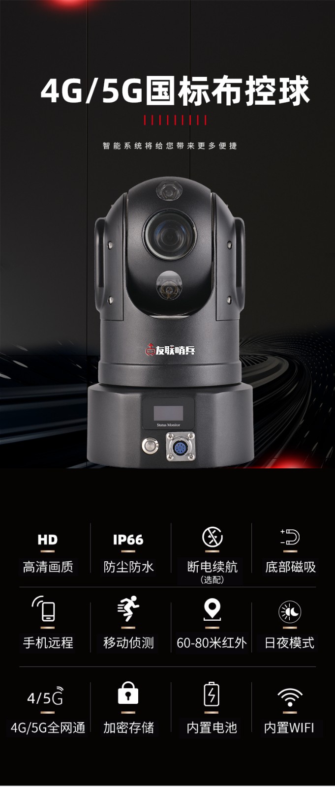 友聯(lián)哨兵4G雙卡智能高清布控球(云臺),是集高清晰攝像、無線圖傳、雙向?qū)χv、實時定位、遠(yuǎn)程回放、云臺操作等多功能于一體的便攜式4G應(yīng)急布控球產(chǎn)品,超高設(shè)備集成度,內(nèi)置高性能鋰電池組,具備防水防震的特性,底座帶有強(qiáng)磁鐵吸盤,可快速架設(shè)于三角支架或車頂?shù)龋瑵M足應(yīng)急布控及快速安裝的特殊要求。廣泛適用于外勤執(zhí)法、偵查布控、安防安保、應(yīng)急指揮、搶險搶修、巡線管理等行業(yè)應(yīng)用,如公安、交警、消防、路政、城管、交通、法院、監(jiān)獄、林業(yè)、電力、水利、環(huán)保等單位。
