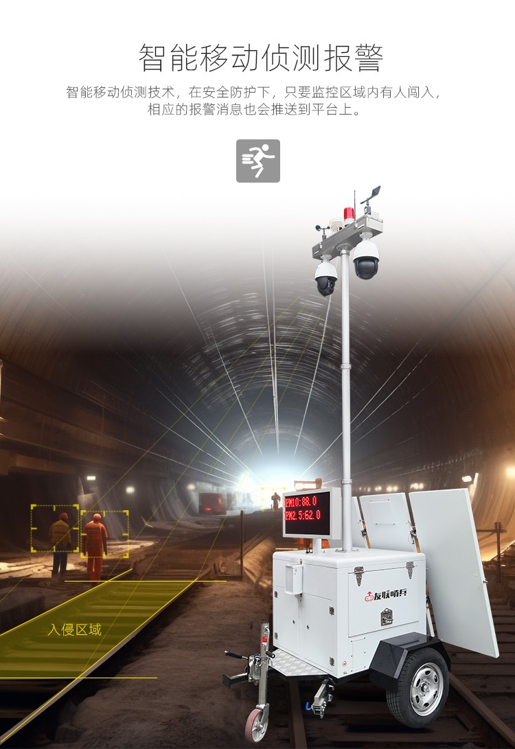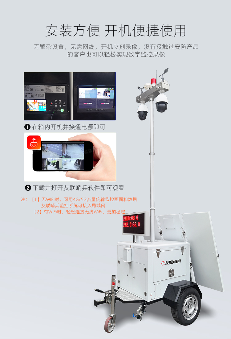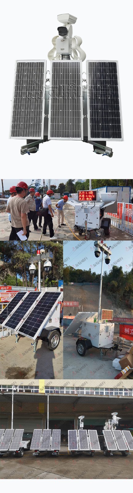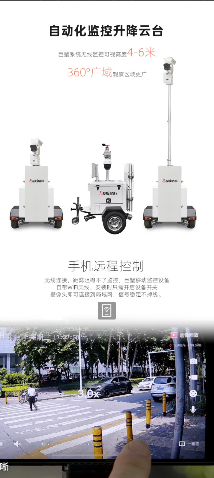 友聯(lián)哨兵雙目太陽(yáng)能移動(dòng)監(jiān)控 ULS-FG 友聯(lián)哨兵ULS-FG系列太陽(yáng)能移動(dòng)監(jiān)控系統(tǒng),采用加厚金屬機(jī)身設(shè)計(jì),集監(jiān)控、升降、供電、控制、存儲(chǔ)和終端顯示于一體,通用性及耐用性更強(qiáng);拖掛式運(yùn)輸轉(zhuǎn)場(chǎng)方式,滿足快速靈活部署需求;結(jié)合風(fēng)能、太陽(yáng)能、蓄電池、市電等互補(bǔ)供電方式,無(wú)線網(wǎng)絡(luò)傳輸為主,無(wú)網(wǎng)無(wú)電的環(huán)境適用;搭載400萬(wàn)360°無(wú)死角智能高清監(jiān)控?cái)z像機(jī),透霧性能強(qiáng),拍攝不受線和天氣影響;可加選AI功能,滿足客戶智能化識(shí)別需求。