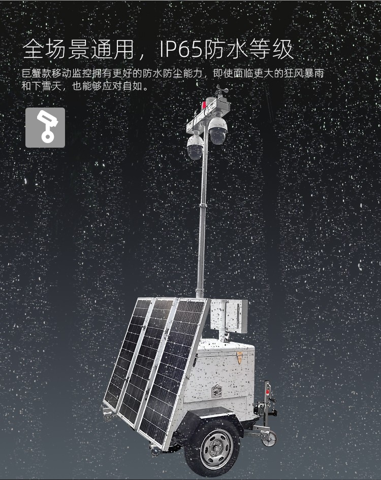 工地?fù)P塵氣象監(jiān)測(cè)太陽(yáng)能移動(dòng)監(jiān)控車 友聯(lián)哨兵巨蟹款太陽(yáng)能供電工地?fù)P塵氣象監(jiān)測(cè)移動(dòng)監(jiān)控車(系統(tǒng)),自帶網(wǎng)電,具備較高的機(jī)動(dòng)性,系統(tǒng)可集高清視頻監(jiān)控、照明、報(bào)警、廣播、對(duì)講、氣象環(huán)境監(jiān)測(cè)(選配)、存儲(chǔ)、控制、無(wú)線傳輸、一鍵升降等功能于一體,并可具備市電、太陽(yáng)能等多種能源補(bǔ)給方式,提升續(xù)航時(shí)間,以適應(yīng)各類復(fù)雜的環(huán)境。戶外使用,不懼風(fēng)雨。