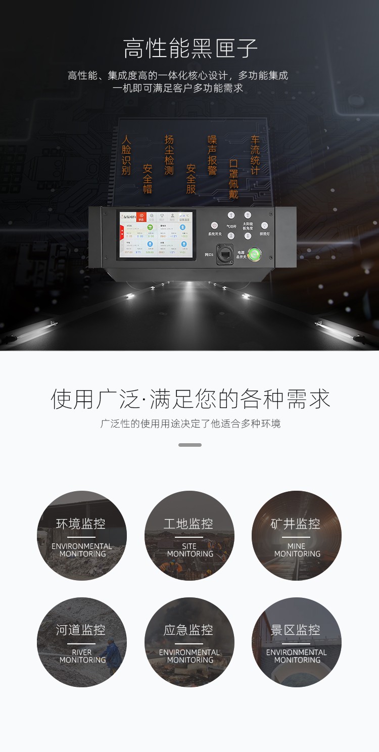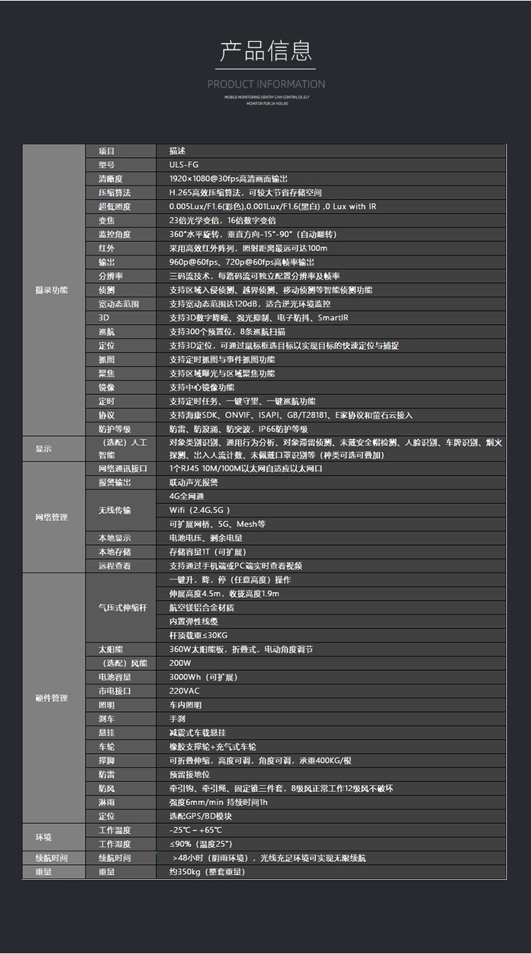 友聯(lián)哨兵風(fēng)光互補(bǔ)雙光熱成像移動(dòng)監(jiān)控系統(tǒng) ULS-FG-THER 友聯(lián)哨兵ULS-FG-THER風(fēng)光互補(bǔ)移動(dòng)監(jiān)控系統(tǒng),是我司推出的解決長(zhǎng)時(shí)間續(xù)航的智能移動(dòng)監(jiān)控設(shè)備,集雙光熱成像云臺(tái)接入、視頻監(jiān)控、升降、供電、控制、存儲(chǔ)和終端顯示于一體,可內(nèi)嵌AI深度學(xué)習(xí)算法,支持人臉識(shí)別、車牌識(shí)別、煙火識(shí)別、非法闖入等分析和處理,通過(guò)無(wú)線傳輸方式傳輸至指揮中心,由指揮中心對(duì)前端設(shè)備自由指揮調(diào)度及下發(fā)指令;該系列移動(dòng)監(jiān)控設(shè)備采用加厚金屬機(jī)身設(shè)計(jì),通用性及耐用性更強(qiáng);拖掛式運(yùn)輸轉(zhuǎn)場(chǎng)方式,滿足快速靈活部署需求;結(jié)合風(fēng)能、太陽(yáng)能、蓄電池、市電等互補(bǔ)供電方式,無(wú)線網(wǎng)絡(luò)傳輸為主,無(wú)網(wǎng)無(wú)電的環(huán)境適用